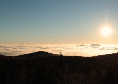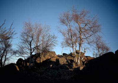 Překvapilo mě, že tam nebylo po sněhu ani památky. Všude suchá vymrzlá tráva a jako bonus malej převis. Vzhledem k tý trávě a větru jsem upustil od oblíbenýho ohníčku a zalezl do pelechu. Těsně před půlnocí mě vzbudili nějaký výletníci, kteří se kolem mě štrachali na vyhlídku. Trochu jsem je postrašil, a za rachotu ohňostrojů dole v kraji jsem zase spokojeně usnul. Spalo se parádně, tím pádem jsem byl ráno schopnej vstát na východ slunce, uvařit kafe, sbalit a prozkoumat ty skalky. První co mě napadlo byl ten film. Všude suchá tráva, pitoreskní skalky, klid, ticho, všechno zalitý sluníčkem. Nádhera.