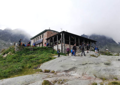 Borovicovým lesem stoupáme po žluté stezce k našemu prvnímu záchytnému bodu, kterým je našlapaný horský hotel Sliezsky dom. Odhadovaný čas na turistickém rozcestníku zkracujeme téměř o polovinu. Přichází čas na naši první a velice oblíbenou horskou svačinu – uvařená domácí vejce. Jsou chutná, výživná a pokud není šílené horko, ve skořápce vydrží 2-3 dny.