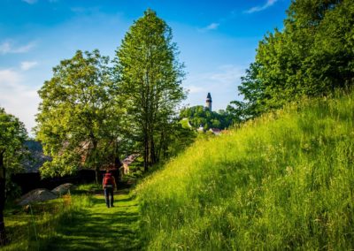 Scházíme dolů z Kotouče a jdeme oklikou přes louky. Vlastně na samotnou Trúbu nemáme ani namířeno. Je totiž podvečer a je načase vyrazit rozdělat tábor, namísto obdivování její historie a dalších pozůstatků štramberského hradu. Avšak ani tak nezoufáme. Odměnou odlehlejších bočních cest, které vedou okolo tuby, nám jsou zcela nové výhledy na samotnou tubu.